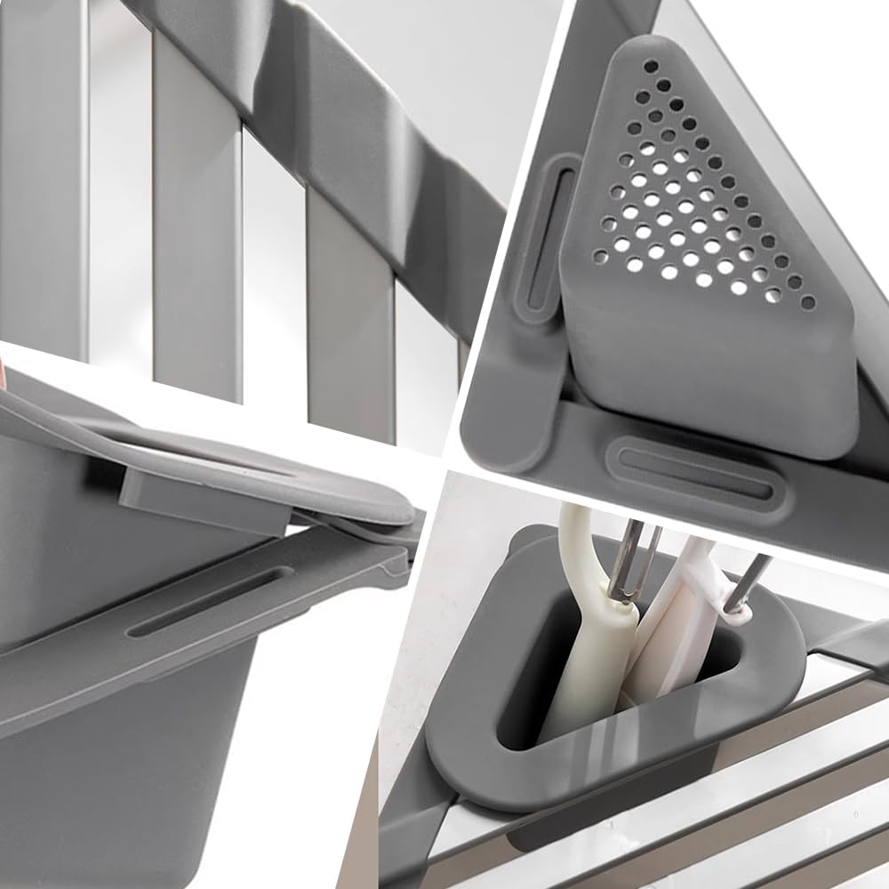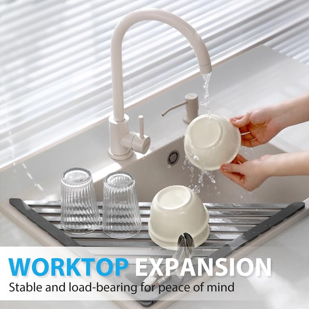 【Premium Materials】 Made from high-quality aluminum alloy and silicone edges. this drying rack for kitchen sink is waterproof. durable. and scratch-resistant. The solid structure features non-slip silicone ends for a secure fit.