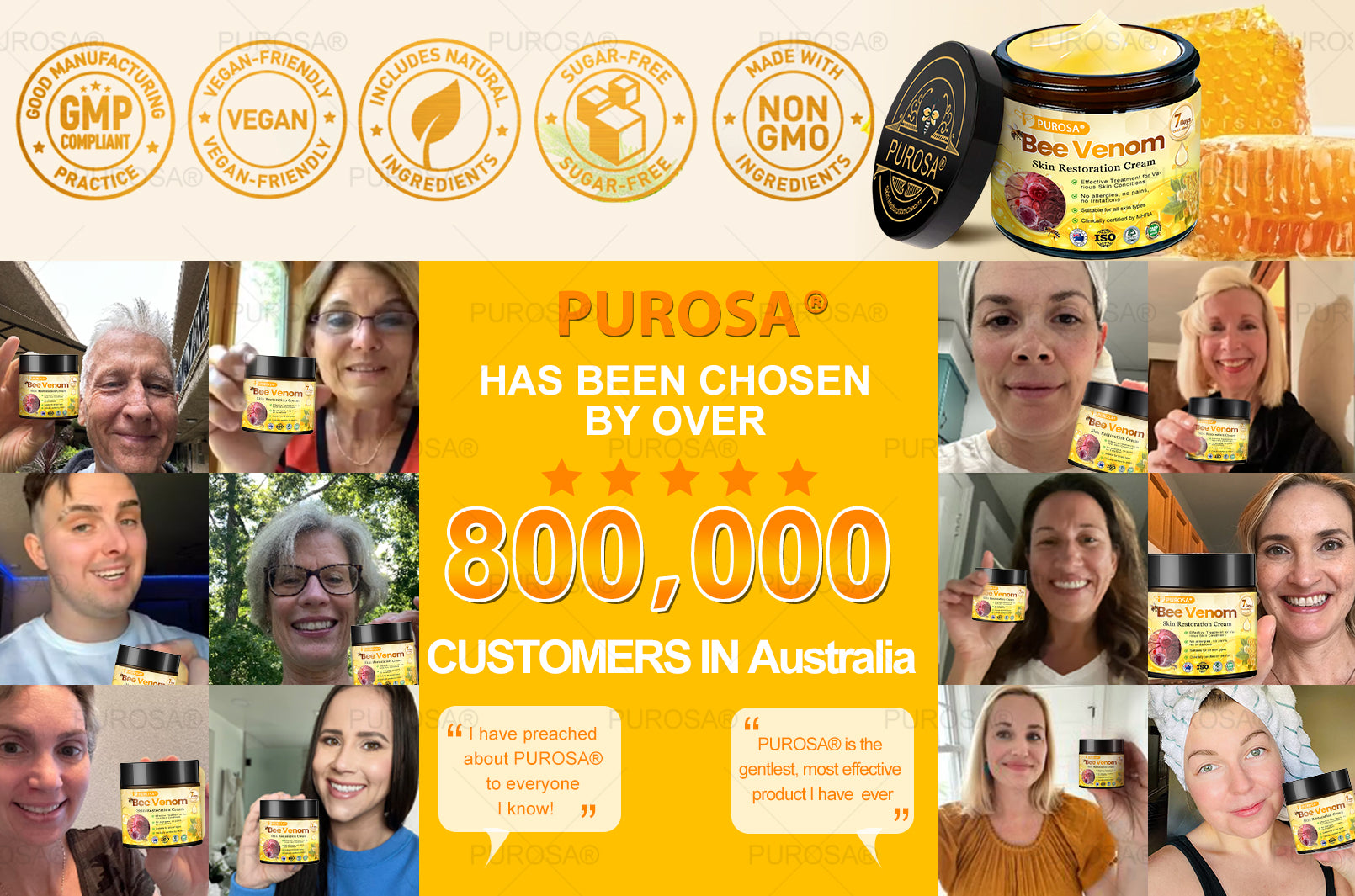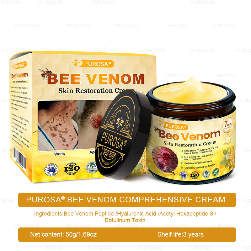 PUROSA® Bee Venom Skin Treatment Cream uses high-quality ingredients to maximize efficacy by locking in moisture, stimulating collagen production, smoothing wrinkles, and repairing damage.