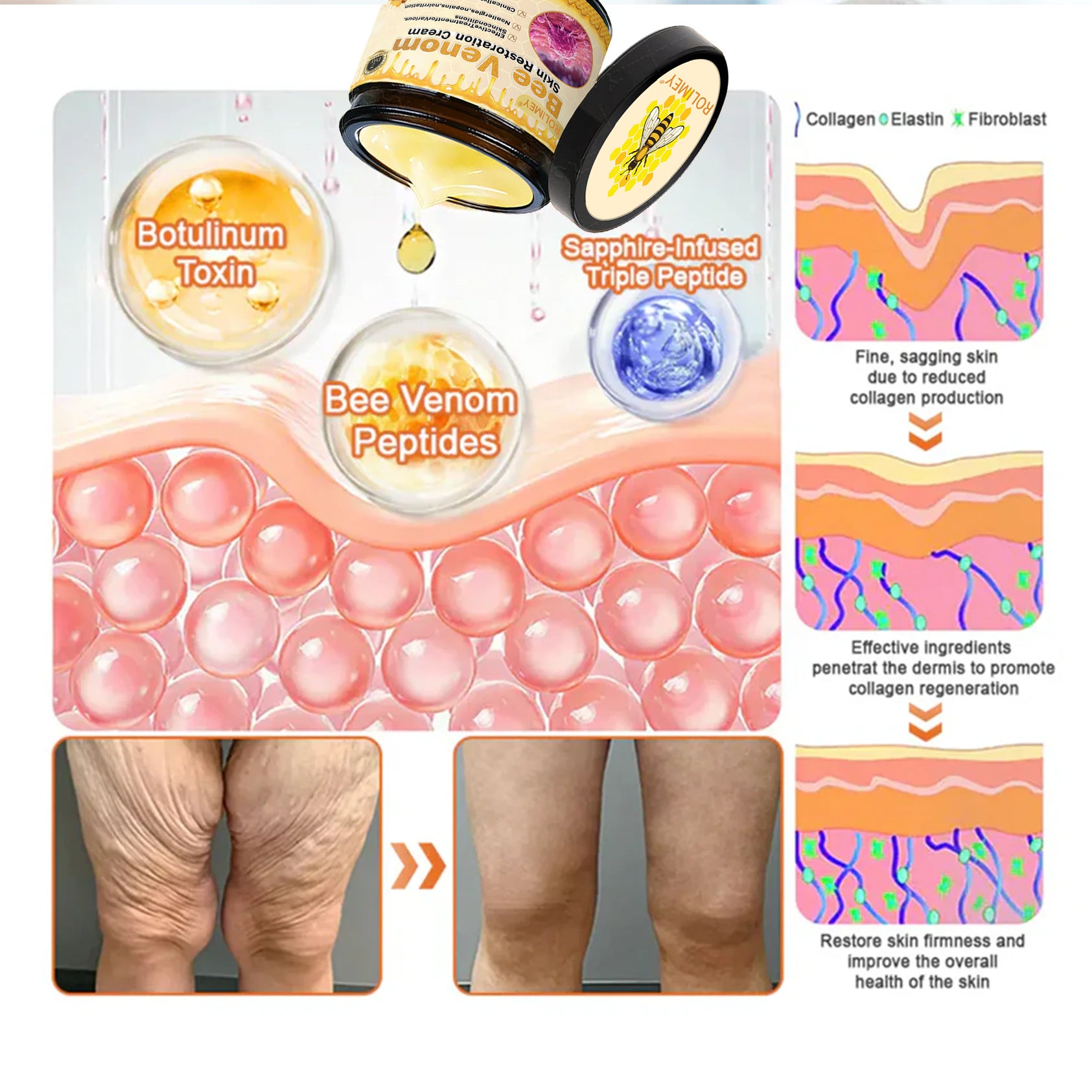 Rolimey® Bee venom Comprehensive Cream addresses all the problems associated with sagging skin, wrinkles and more!