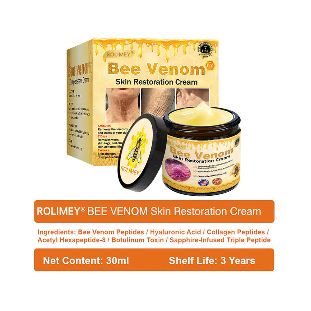 The Rolimey® Bee venom Comprehensive Cream is an effective solution for diminishing visible signs of aging and wrinkles, resulting in a rejuvenated skin appearance within a span of 3-5 weeks. This cream incorporates scientifically proven ingredients like Sapphire-Infused Triple Peptide, Tri-Hyaluronic Acid and Micro Algae which effectively combat wrinkles and promote skin vitality.