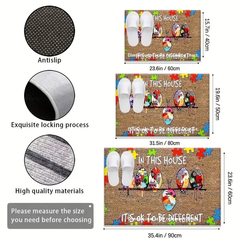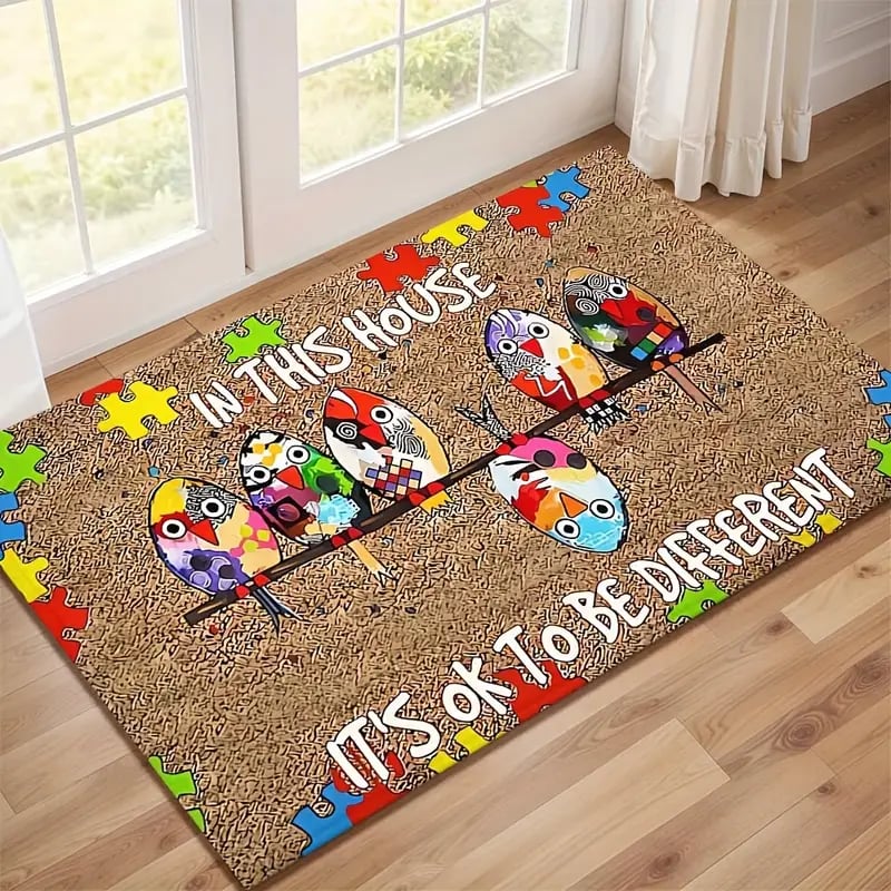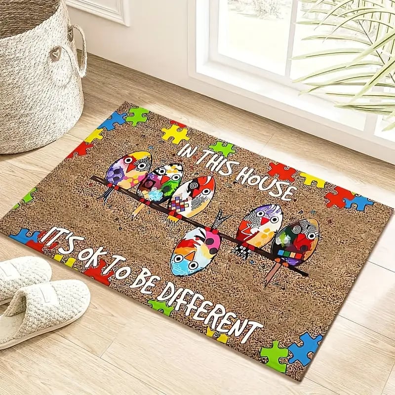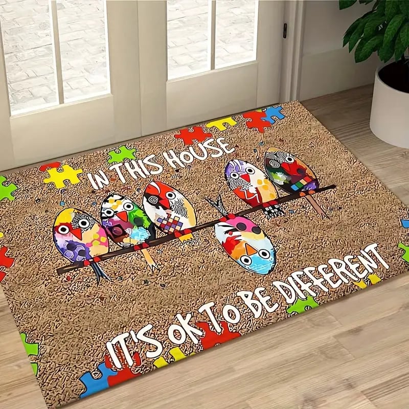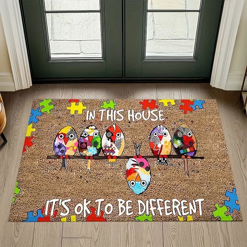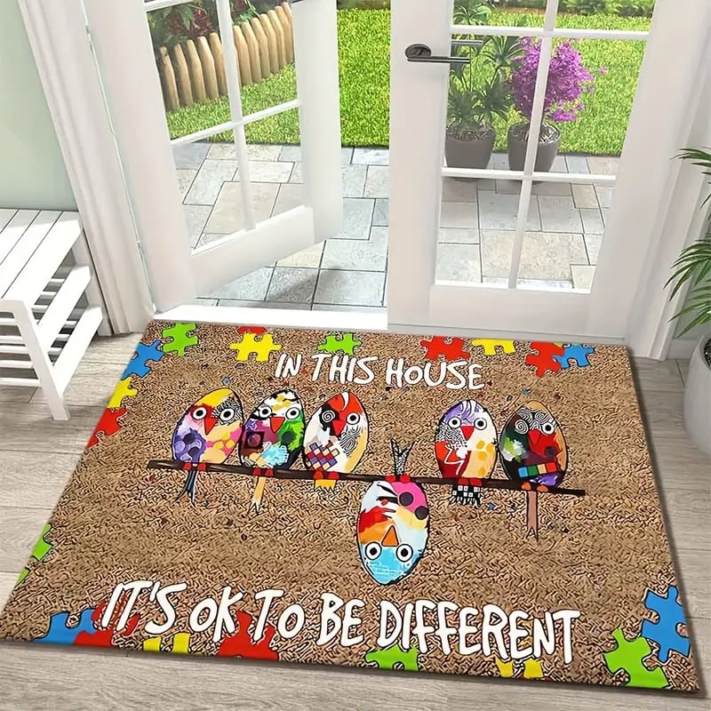 🐦This doormat features five charming. colorful birds perched together. surrounded by bright puzzle pieces—the universal symbol of autism awareness.