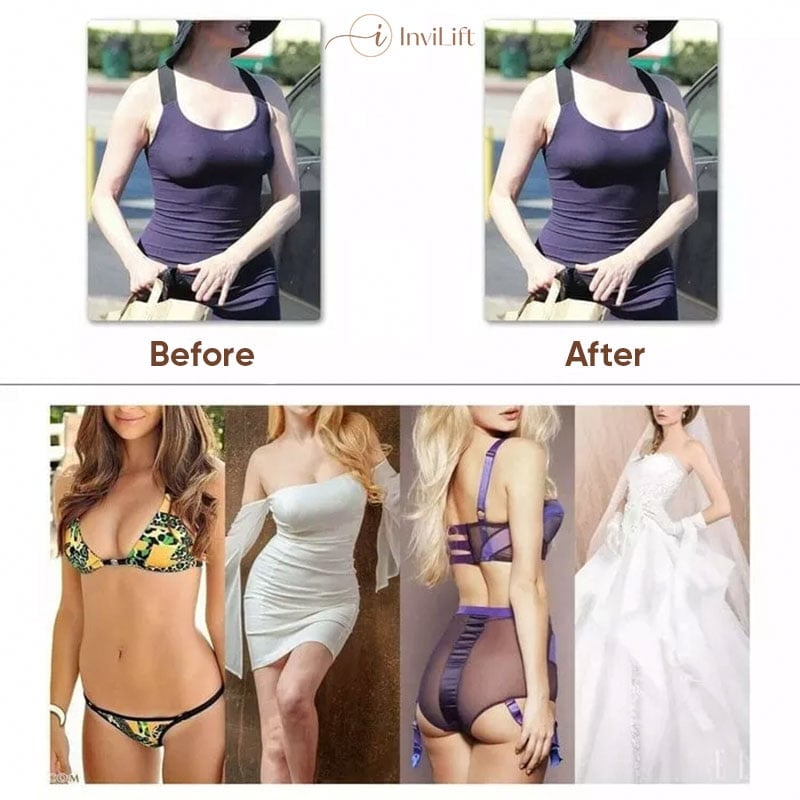 No need to worry about your bras falling down! With 01 anti-slip back & 02 detachable straps and a snug fit. InviLift will hug your body and stay in place the whole day.