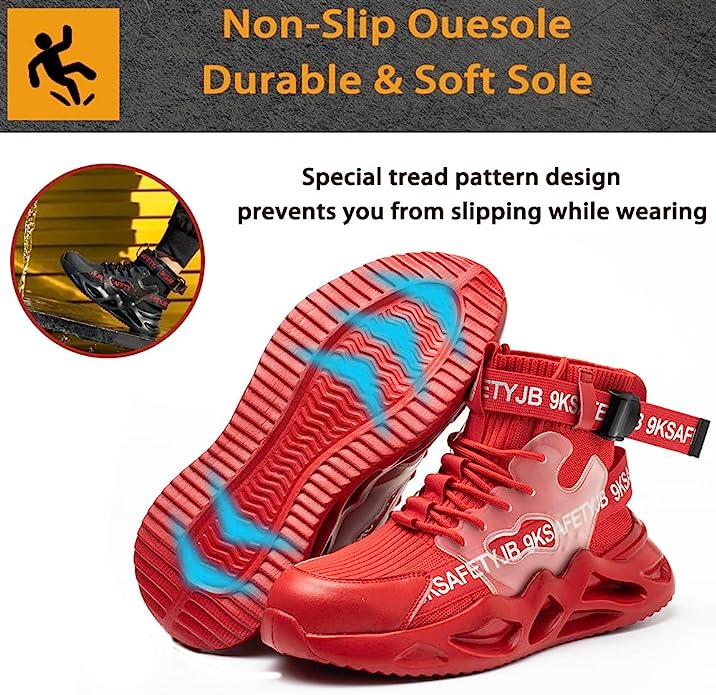 Metallic. asymmetrical-shaped toe cap. Impact and compression resistance meet EU and US safety standards. The steel toe toe shoes help to protect feet from falling or rolling objects.