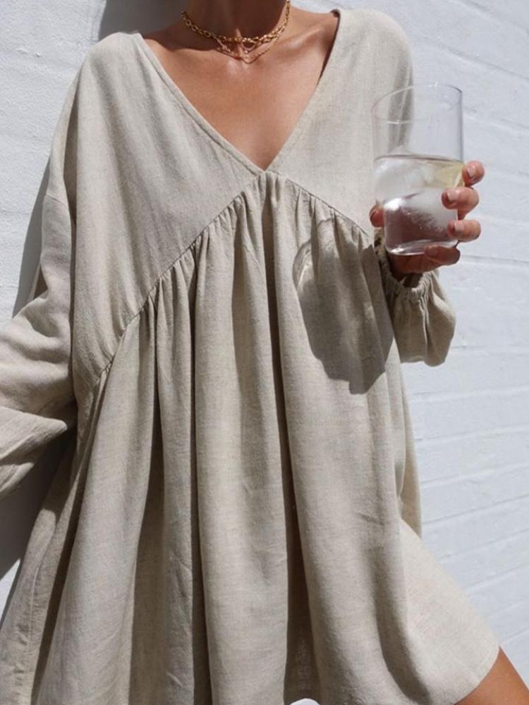 V-Neck Cotton Linen Long Sleeve Mini Dress